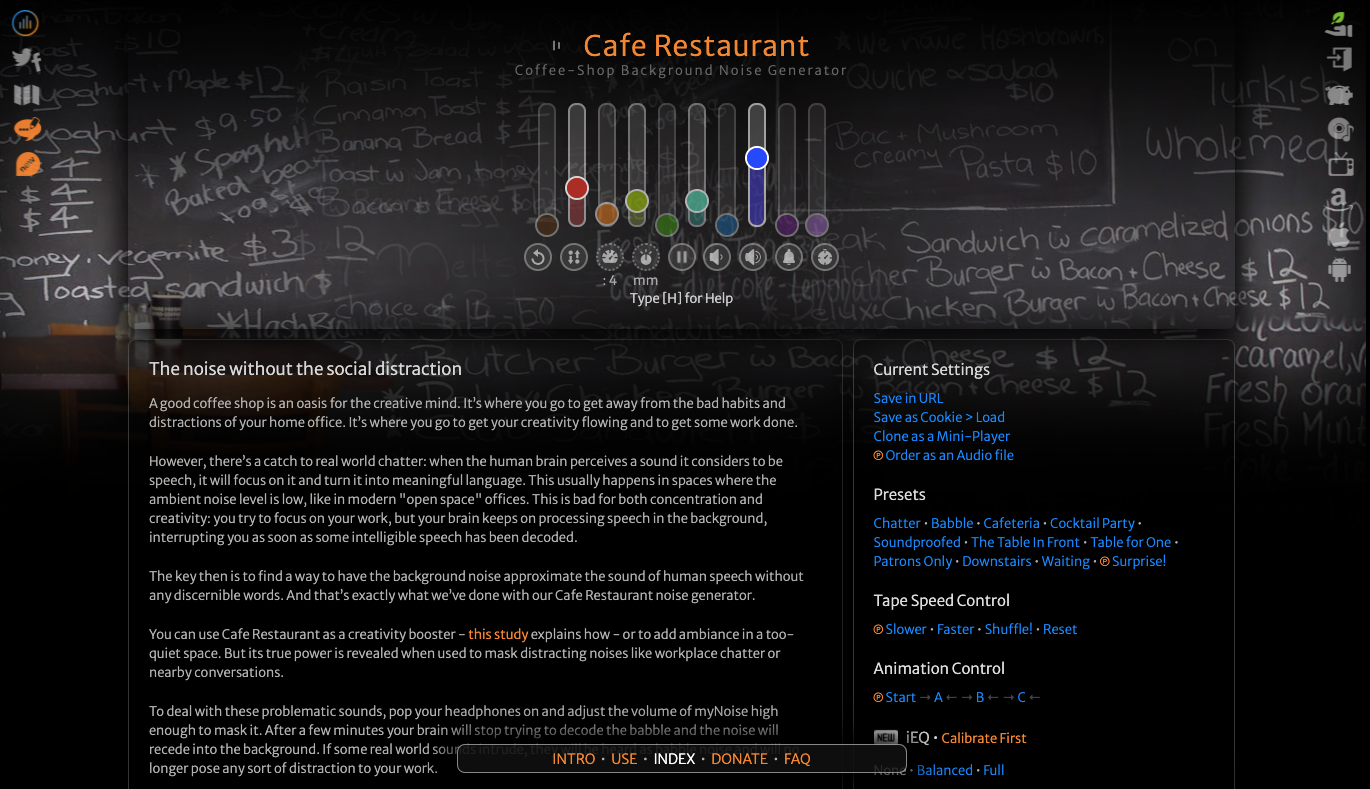 The Ultimate Cafe Restaurant Background Noise Generator. Reminds me of the coffee shops or libraries at my school. MyNoise is probably the best background noise generator on the internet.